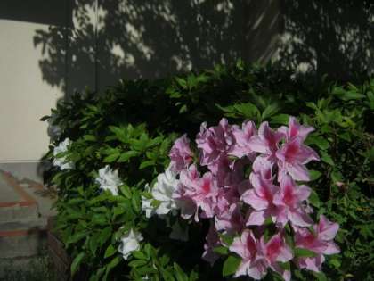 ふだんから管理作業員さんがお手入れをしてくださり、今年もたくさんの花を咲かせています。淡路中学校では、中庭をはじめ正門前の道路沿いにも多くのツツジが植えられ、5月上旬頃まで、白やピンク、紅色の花々を楽しむことができます。