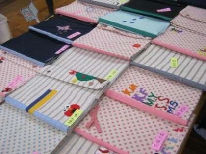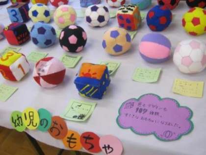 授業で1年生が作成した「ファイルカバー」(写真 左)と3年生が作成した「幼児のおもちゃ」(写真 中)。素敵な作品が、並べられていました。同じものが2つとないのが、手作り作品のよさ。「幼児のおもちゃ」では、一人ひとりが、小さな子どもが手に取り、楽しく遊ぶ場面を思い浮かべて作成したことでしょう。