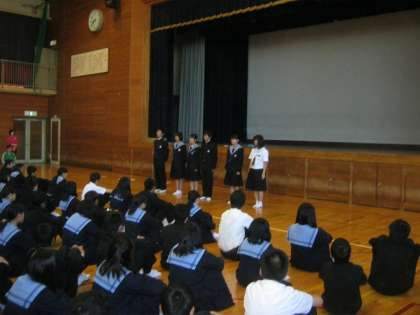 認証式の後、生徒会役員の皆さん6名がずらっと並び、生徒会活動にむけた抱負を話しました。会長からは「皆さんと協力しながらさまざまな行事を成功させましょう」との呼びかけがあり、生徒の皆さんが拍手で応えていました。