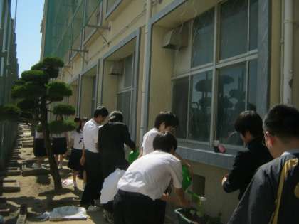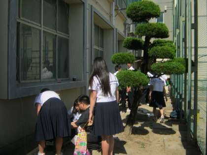 各クラスが班に分かれて、大型プランターにキュウリの苗を植えていきます。運動場に面した場所にプランターとつるをからませるネットがずらっと並びます。日当たり抜群なので成長が楽しみです。(昨年も巨大キュウリがたくさんできました!)