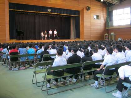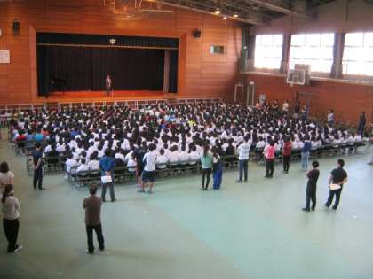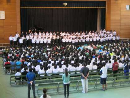 両校の児童・生徒合わせて700名近くが式に参列します。式場(淡路中体育館)はけっこう広いのですが、これだけの人数が集うと壮観です。校歌や子どもたちによる開校宣言など、本番同様に練習しました。