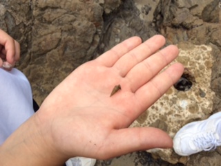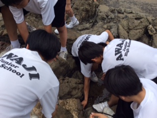磯観察では、潮が引いた後の岩のくぼみにかくれている生物を探しました。