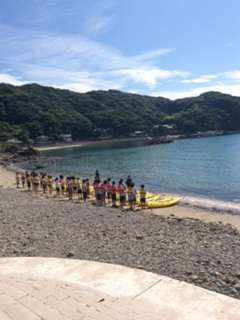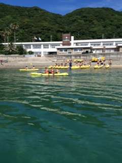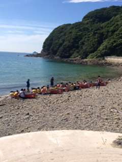 カヌー、カヤックチームが自然の家のスタッフから諸注意を受けています。ライフジャケットに身を包みいざ海へ漕ぎ出します。潮の香りを全身に受け、海洋体験を満喫してください。