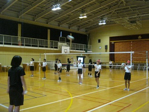 (上から)<バレー部>パス練習を通してボールに慣れましょう
