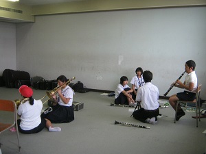 また吹奏楽部では、トロンボーンやトランペットなどの楽器を小学生に吹いてもらいました。実際には、思ったように音が出ず、想像以上に難しかったかも…。