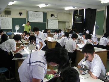 顕微鏡の実験を行った、理科の授業(写真 中)、