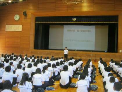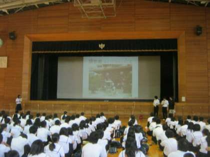 まずは教室で宿題の回収から。体育大会の学級旗のデザインや各教科の提出物などを担任の先生に手渡します。学級活動の後、体育館に全員が集まり集会を開きました。集会では各サークルのメンバーが夏休み中の活動を報告。ふだん行けない校外での活動(フィールドワーク)や他校との交流を紹介し、楽しく活動していることを伝えました。