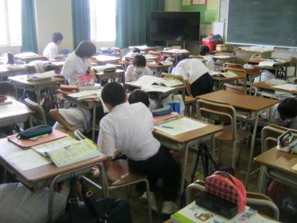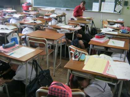 放送が流され、皆さん机の下に避難します