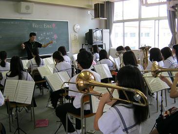 地域の行事で演奏する吹奏楽部が朝練をしています。(写真左)