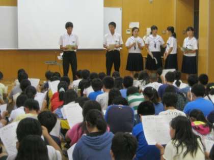 生徒会役員の皆さんが、淡路中学校のようすを冊子にまとめ、1人ずつ紹介します。体育大会や泊行事・定期テストなどの学校行事をはじめ、服装や登校時間、授業の受け方等、中学校生活全般に関してていねいにお話ししてくれました。