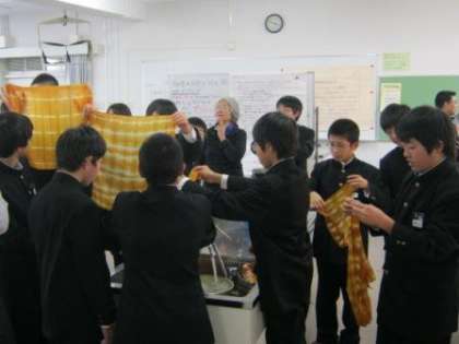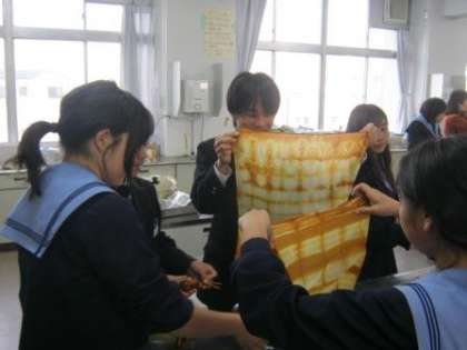 生徒と教員の40名が4班に分かれて、「布のしぼり」と「染め」に挑戦しました。講師の先生がなべなども持参され、事前に「布の下処理」と「染料液づくり」の用意をしていただいたおかげで、作業はとてもスムーズに進み、参加した生徒たちは、サークルを超えて実に楽しそうに作業をしていました。また、しっかりと協力して後片付けもしていました。作品は、家に持ち帰ったあと、陰干しをして、裏からアイロンを当てて完成してくれたことと思います。一人ひとりのデザインは、広げて初めてわかるのですが、すべて異なる模様が現われ、個性的な素敵な作品に仕上がりました。