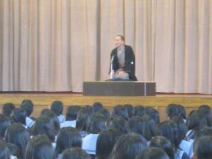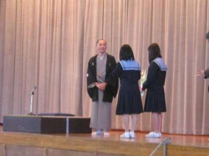 続いて、有名な「まんじゅうこわい」の一席。20分を超えるお噺でしたが、その芸の巧みさに、生徒のみならず教員も保護者も引き込まれ、素敵な時間を過ごすことができました。最後には、生徒代表の感謝の言葉と花束の贈呈。会場の人たちは、穏やかな表情で会場を後にしました。