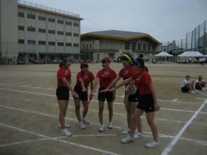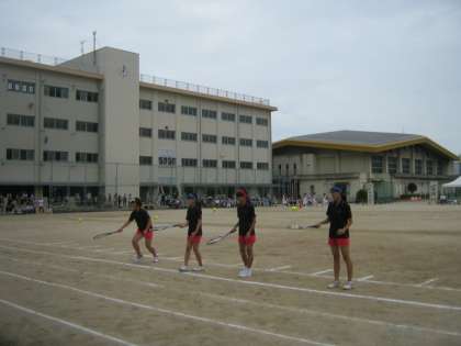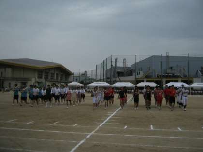 文化部と運動部(男・女)が400mリレーに挑みます。出場選手は、クラブ紹介をかねてグラウンドを行進します。途中で、練習風景などのパフォーマンスを織り交ぜながら楽しく行進していました。