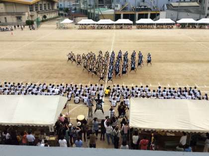 美術の授業でステンシル(版画)の技法を使って作成した手作りのハッピに身を包み、力強い踊りを披露しました。今回の演舞は一部「マスゲーム」の要素も取り入れ、集団の隊形(隊列)がさまざま変化していきます。