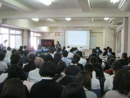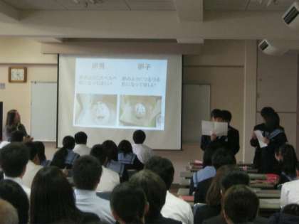 育児の疑似体験を通して感じたことを、グループ毎に発表します。仲間に助けてもらったことや、乳幼児期の自分を育ててくれた親への感謝など、心温まる発表に思わず笑みがこぼれます。