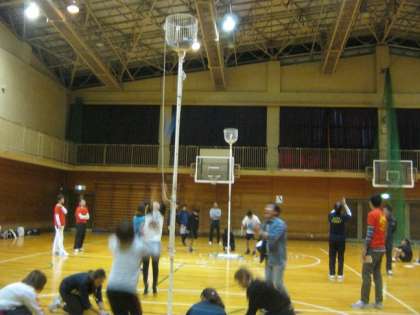 「アジャタ」と呼ばれるニュースポーツ。運動会での「玉入れ」をスポーツ競技に進化させたとのこと。4〜6名の選手が、100個のボールを高さ4m12cmのカゴに投げ入れ、ボールを全部入れるまでのタイムを競います。