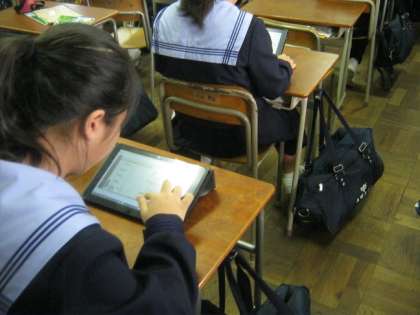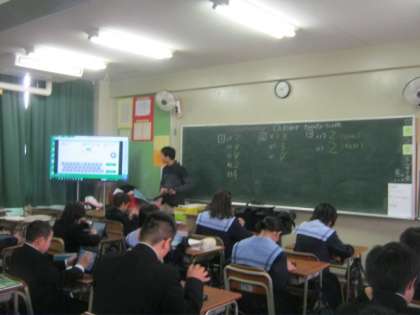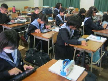 1年生英語の授業で、タブレット端末を使って学習に取り組みました。