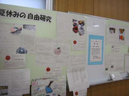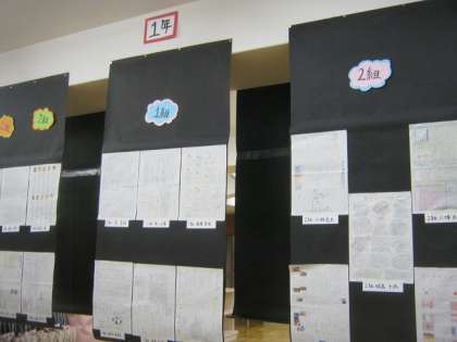 理科・社会科からは、自由研究作品を展示しました。理科では、アルコールパッチテストやカビが発生する仕組み、太古の生き物など、生徒たちが自由にテーマを選び、調べたレポートが並びます。社会科では、地理や歴史新聞を作製しました。興味・関心のある国を選んで各国の特色をまとめたものをはじめ、世界遺産・歴史上の登場人物など、バラエティ豊かな作品がそろいました。