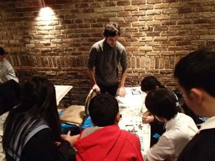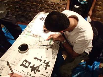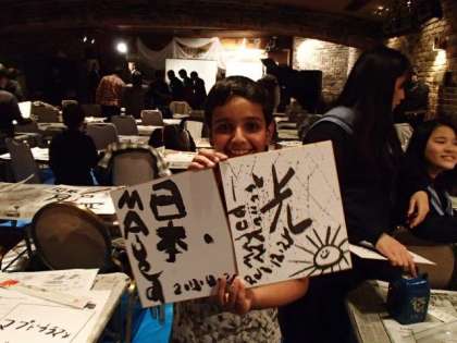 カタールで使われているアラビア語は右から左に書いていく言葉(言語)。そのため、漢字を書くときも筆を右から左へ動かしてしまい、かなり書きにくそうでしたが、自分の選んだ漢字と日付、アラビア語の名前とカタカナを色紙に書きました。