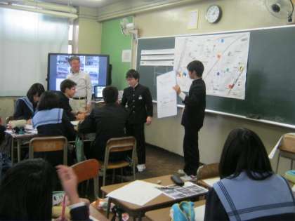 コンビニは生徒たちにとって身近に感じられる題材。グループ協議ではいろんな意見が出ており、実り多い授業となりました。