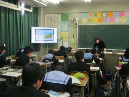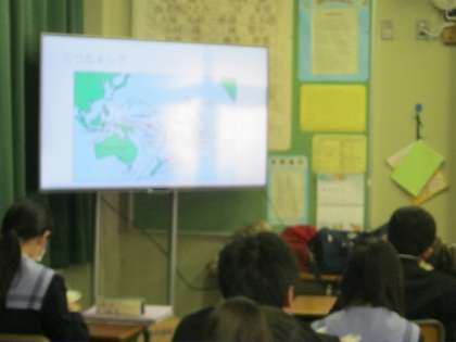 今回はオーストラリアを勉強します。コアラやカンガルー、ラグビーなど私たちがよく知っている動物やスポーツで知られる国ですが、授業では自然や産業の特色も学んでいきます。電子黒板を活用し、有名な逆さ地図などを紹介しました。