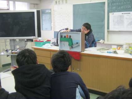 理科室で授業をうけます(地震が起こるしくみを説明中)
