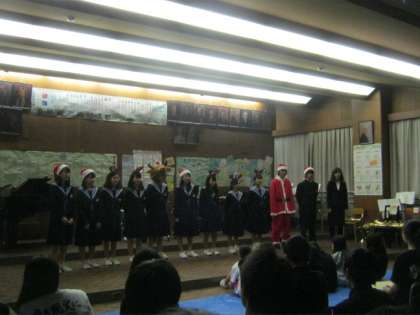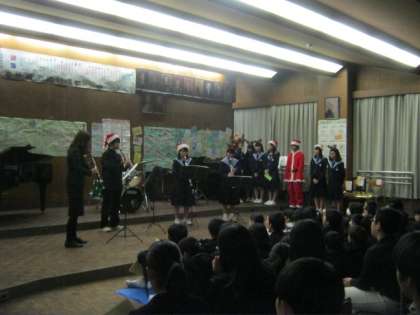 終業式後の午後、音楽室に生徒・先生方、保護者の皆さまが集まります。オープニングは「きよしこの夜」。吹奏楽部の皆さんの合唱がクリスマスの雰囲気を盛り上げます。ソロ演奏や(クラリネットの)四重奏など、さまざまな演奏が続きます。曲目もクラシックに日本のポップスなどバラエティにあふれ、吹奏楽部員の皆さんのレパートリーの広さを感じました。