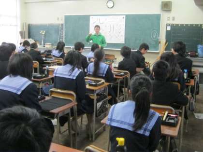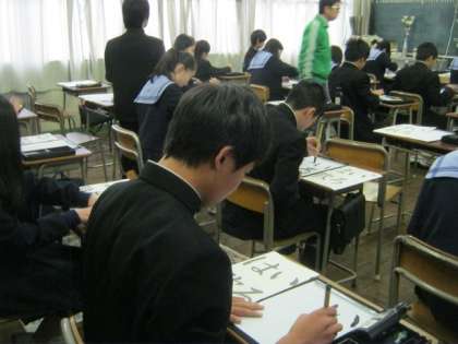 淡路中「書写教室」を使って授業をします。この日のお題(?)は「いろは歌」。ひらがなは簡単そうに見えますが、かえって美しく書くのが難しそうですね。先生から書き方の要点を教わった後、さっそく練習に励みます。