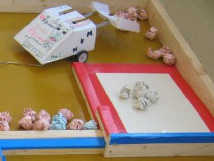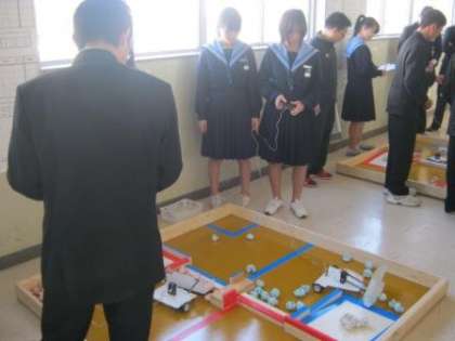 まずは、3人1組で創意工夫を凝らしたロボットの作製。次に、細かな調整を重ね、予選リーグの試合を行います。