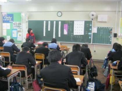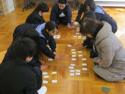 1年生の授業では、保護者やご家族が一緒に参加しての百人一首。グループに分かれて楽しそうに札を取り合っていました。(写真 左)、2年生は、詩聖「杜甫」の漢文を「起承転結」をふまえて鑑賞していました。(写真 中)