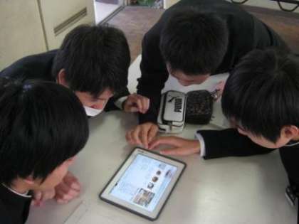 3年生の家庭科の授業では、iPADを使用して調理実習のメニュー調べ。このあとは、iPADを使用してメニューのプレゼンテーション、調理実習と計画されています。「たこ焼き・クレープ」を候補にしているグループなど、楽しそうに授業が進められていました。(写真 右)