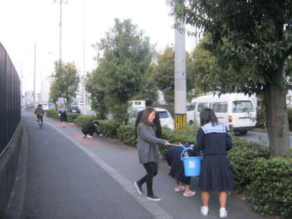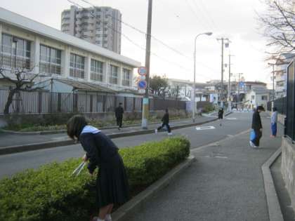 美化委員や学級代表さん、生徒会役員の皆さんに有志のメンバーが参加し、校舎中庭や学校周辺を清掃します。午前8時前に集合し、火バサミとバケツを手にして次々にゴミを拾ってくれました。歩道横の植え込みには空き缶やパン・お菓子の包み紙がどっさり。みんなで協力して、スッキリきれいにしてくれました。