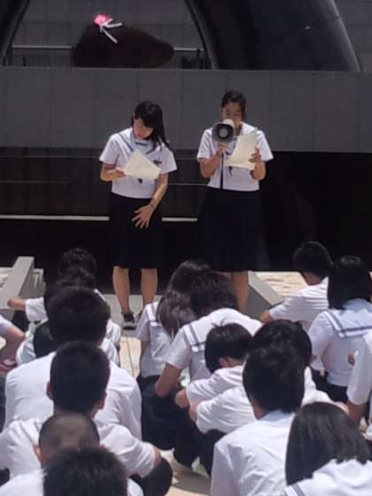 式典広場で「平和のセレモニー」を行いました。平和宣言のあとに黙祷し、3年生で作った千羽鶴を捧げました。
