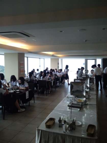 修学旅行2日目の朝ご飯です。食堂からの素晴らしい景色を眺めながら、朝ご飯をいただいています。このあと、美ら海水族館に向けて出発します。