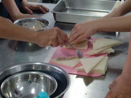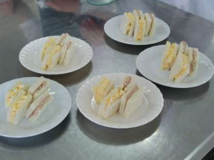 2年1組の家庭科の時間に「ツナサンドと卵サンド」を作りました。パンの耳を切る生徒、ツナをマヨネーズであえる生徒、ゆで卵を準備する生徒など、各班で役割分担をして調理しました。とても美味しいサンドイッチができました。
