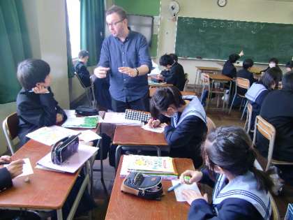 1年2組の英語の授業で、C−NET(外国人英語指導員)の先生に「フォニックス」について指導してもらいました。生徒たちは、アルファベットの読み方と違って難しそうでしたが、ネイティブの生の発音を聞いていい刺激になったようでした。