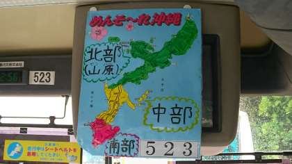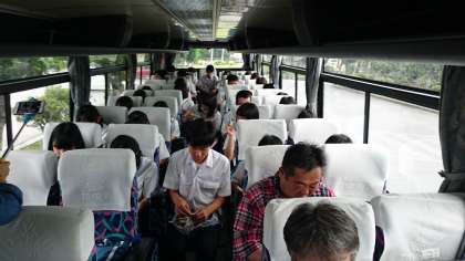 空港からバスで平和祈念公園に移動しました。公園の芝生で昼食の予定でしたが、雨のためバスの車内で昼食をとることにしました。