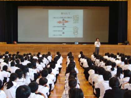 全校生徒が体育館に集合し、まとめとして、区役所保健福祉課の担当者、淡路地域の防災リーダーの隊長、西淡路の地域防災リーダーの隊長から講評をいただきました。
