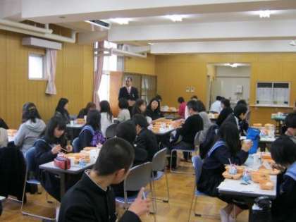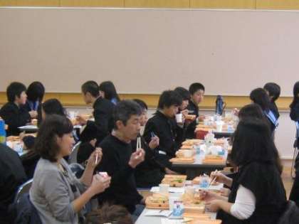 学校保健委員会の一環として、内科校医先生、薬剤師先生、校区小学校の栄養教諭の先生、保護者の皆さん、生徒会執行委員と保健委員の皆さん、本校の教職員で試食会を行いました。東淀川区役所もご協力いただいた試食会のメニューは焼き魚などの和食。試食後は、それぞれに意見交換をし、アンケートを記載してまとめとしました。出席いただいた皆さん、ありがとうございました。アンケートの結果は東淀川区役所でとりまとめていただき、大阪市教育委員会にも報告される予定です。皆さんの意見が少しでも反映されるといいですね。