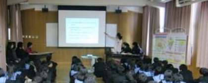 まずは、指導養護教諭の先生から、事前に行った生徒アンケートの結果を聞きながら、「食べること」などの大切さを学びました。次に、淡路小学校の栄養教諭の先生から、「食事の大切さ」などについてお話を伺いました。