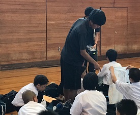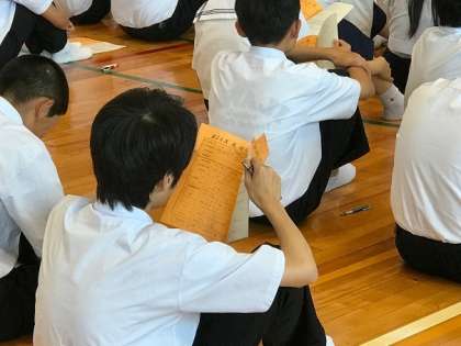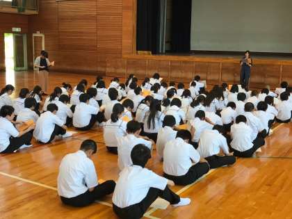 1年生が明日から堺市立日高少年自然の家に一泊移住に行きます。今日は「目的」「服装」「活動班での整列」「持ち物」等の最終確認を行いました。