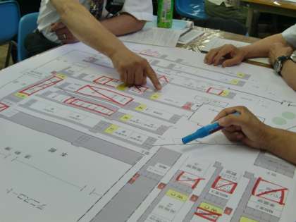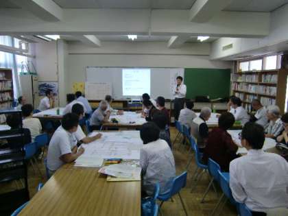 第2部講演会では東淀川区役所の保健福祉課安全安心企画の方にお越しいただき「『避難所運営について』〜過去の災害から学ぶ地域防災について〜」と題して、ご講演をしていただいた後、皆さんで淡路中学校を避難所とした避難所運営について考えました。
