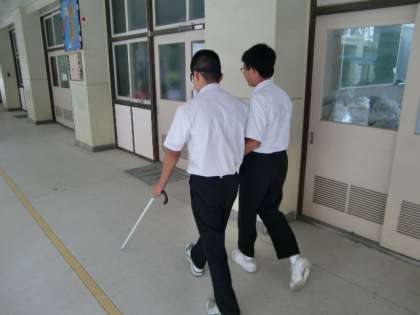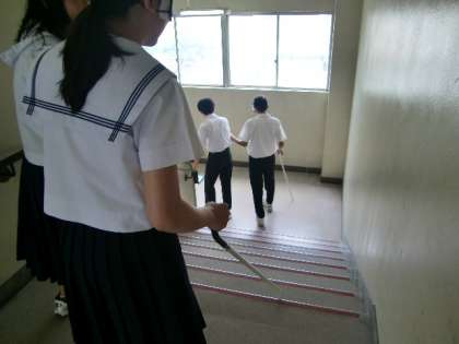 2人一組になり、校内の廊下や階段を「アイマスクをつけて歩く生徒」と「誘導する生徒」、また、「白杖を使って歩く生徒」と「誘導する生徒」を交互に体験しました。