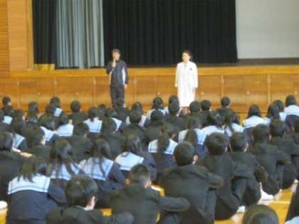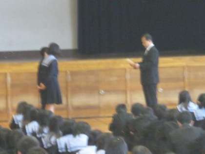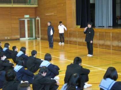校長先生から、学年の代表の生徒に修了証が手渡され(写真 中)、その後、1年間の成長や成果を高く評価するとともに、ますますの活躍・成長を期待しているとの講話がありました。また、各担当の先生から、春休みを、安全・健康に過ごすことについての話がありました(写真 左)。最後には、生徒会長からキャンペーン活動などへの協力に対するお礼のスピーチがありました(写真 右)。