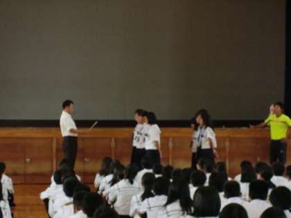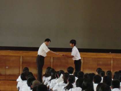 まず始めに、夏休み中に開催された大会の賞状授与を行いました。どの部活動も夏休み、暑い中、一生懸命取り組んでいました。本当によく頑張りました。