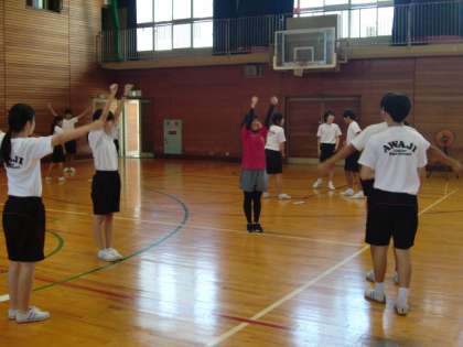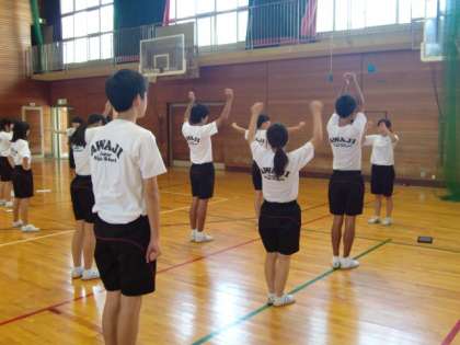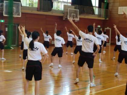 体育大会の学年演技であるダンスの授業で、班に分かれて、ダンスリーダーを中心に協力しながら教え合いました。また、タブレット端末を活用し、動きを確認しながら、お互いにアドバイスしあいました。初めはうまくいかないこともありましたが、練習を進めていくと、リズムに乗って楽しくダンスができるようになりました。