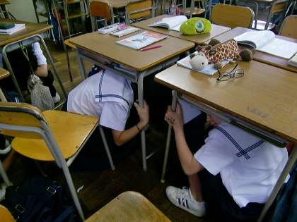 11時に屋外スピーカーから地震の発生が知らされ、校内では緊急放送で身体の安全確保を呼びかけました。3時限目の授業中の各教室では、教科担当の先生の指示で一斉に机の下に身を隠す訓練を行いました。その後、11時3分に、大津波警報が発表され、校舎4階への避難を確認しました。