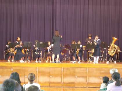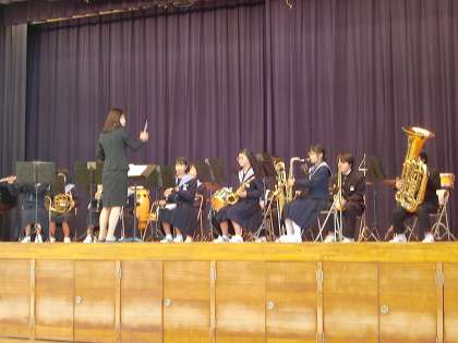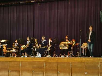 開会宣言の後、最初の舞台発表で吹奏楽部が演奏を披露しました。3年生が引退し、1・2年生中心の発表は今回が初めてでした。少し緊張していたようですが、部員の皆さんの熱演に、会場から大きな拍手をいただきました。