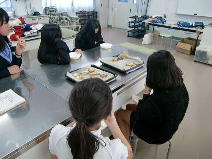 (上から 中学生よりあいさつと説明 女子バレー部 家庭科部)