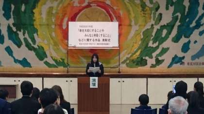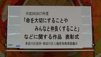 東淀川区人権啓発推進協議会主催の「命を大切にすることやみんなと仲良くすること」などに関する作品の表彰式が区民ホールで行われました。